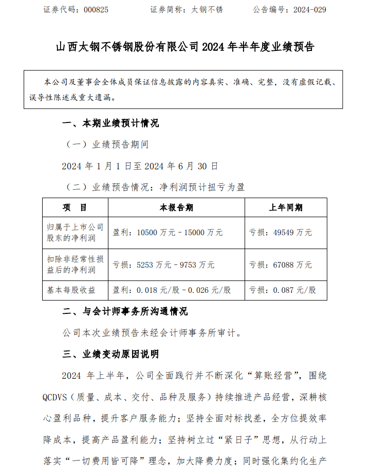 太鋼不銹(000825)7月9日晚間披露業(yè)績(jī)預(yù)告,預(yù)計(jì)2024年上半年歸母凈利潤(rùn)1.05億元至1.5億元,上年同期虧損4.95億元;扣非凈利潤(rùn)虧損5253萬元至9753萬元,上年同期虧損6.71億元;基本每股收益0.018元/股-0.026元/股。