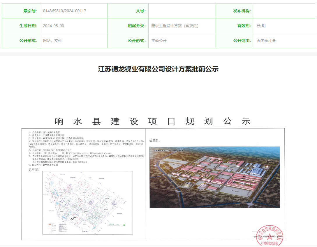 5月6日,江蘇德龍鎳業(yè)有限公司設(shè)計方案批前公示,公示時間:5月6日-5月15日。
