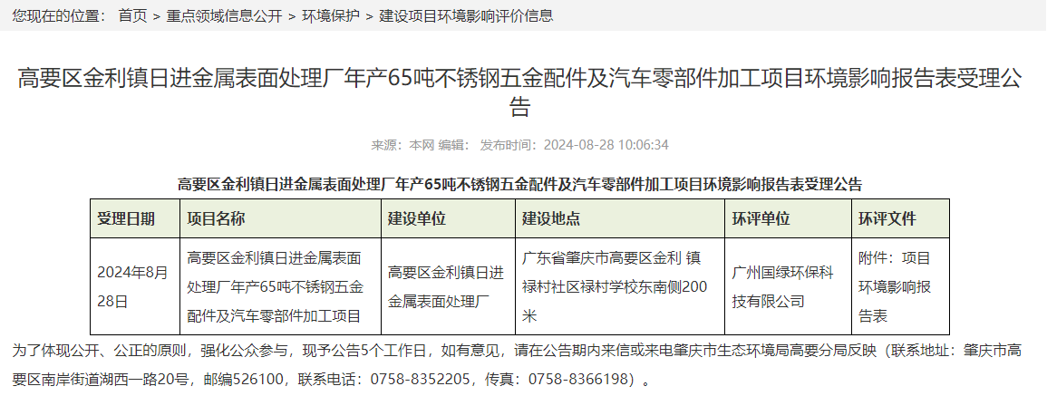 8月28日,肇慶市高要區(qū)金利鎮(zhèn)日進金屬表面處理廠年產(chǎn)65噸不銹鋼五金配件及汽車零部件加工項目環(huán)境影響報告表獲受理公告,公告期:5個工作日。