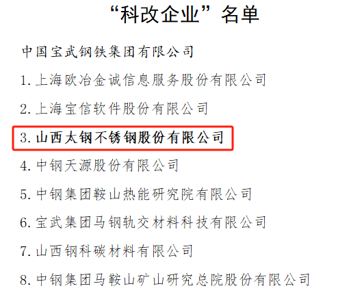 6月20日,國(guó)務(wù)院國(guó)有資產(chǎn)監(jiān)督管理委員會(huì)公布最新“科改企業(yè)”名單,據(jù)名單顯示,山西太鋼不銹鋼股份有限公司入選其中。