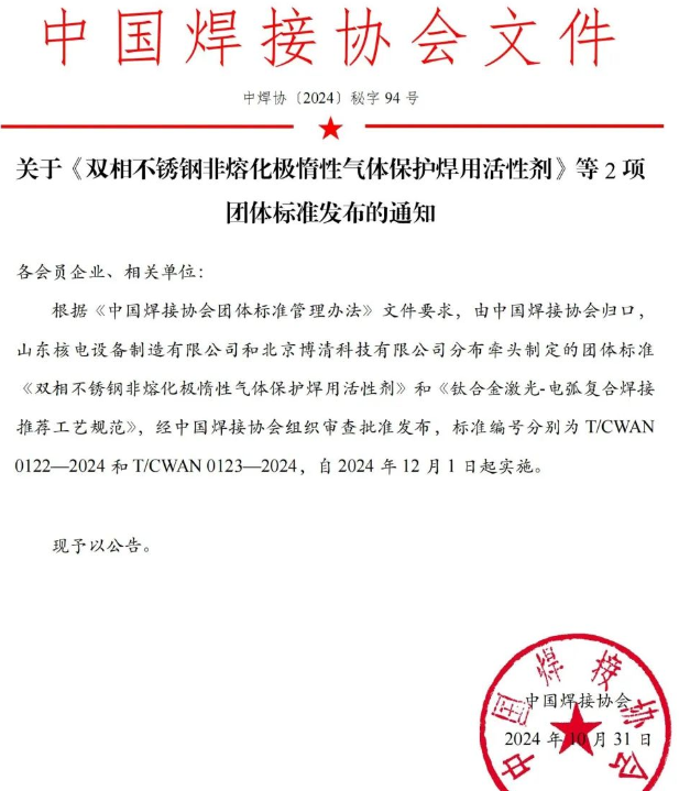 2024年10月31日,據(jù)中國焊接協(xié)會關(guān)于雙相不銹鋼非熔化極惰性氣體保護焊用活性劑》等2項團體標準發(fā)布通知稱,由中國焊接協(xié)會歸口山東核電設(shè)備制造有限公司牽頭制定的團體標準《雙相不銹鋼非熔化極惰性氣體保護焊用活性劑》標準編號為T/CWAN0122-2024,該標準將于2024年12月1日起實施。