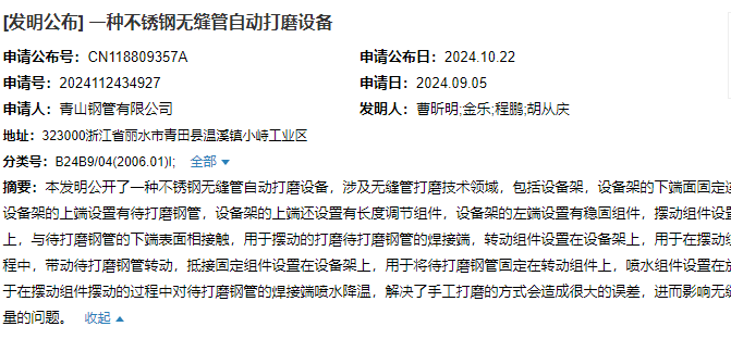 2024年10月22日,青山鋼管有限公司成功申請一項名為“一種不銹鋼無縫管自動打磨設(shè)備”專利,申請公布號為CN118809357A,申請日期為2024年9月5日。