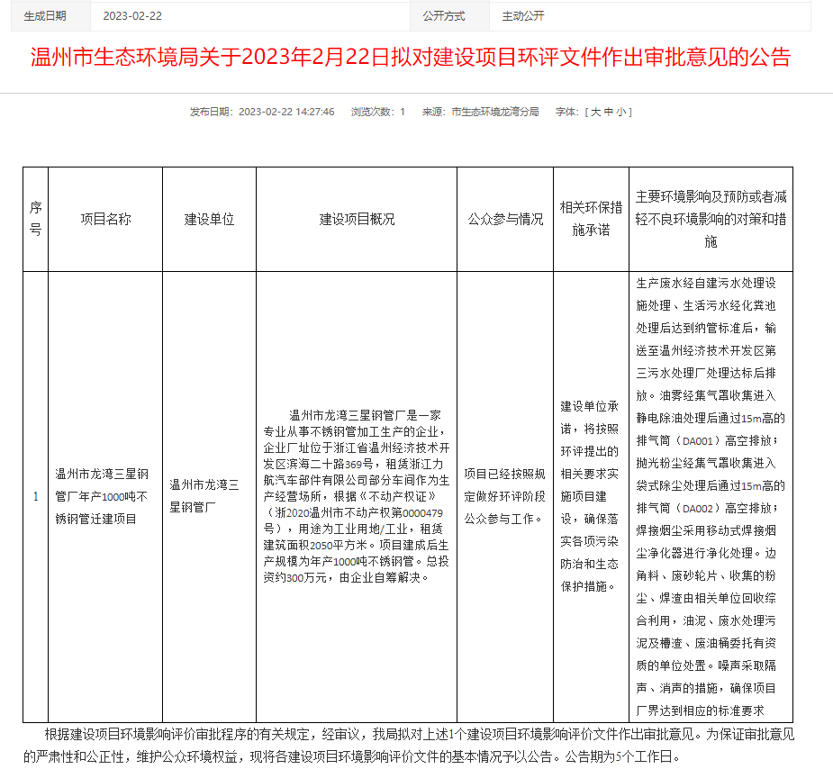 2月21日,溫州市生態(tài)環(huán)境局龍灣分局就溫州市龍灣三星鋼管廠年產(chǎn)1000噸不銹鋼管遷建項(xiàng)目環(huán)境影響評價報(bào)告表作出審批意見并對外進(jìn)行公告,公告期:5個工作日。